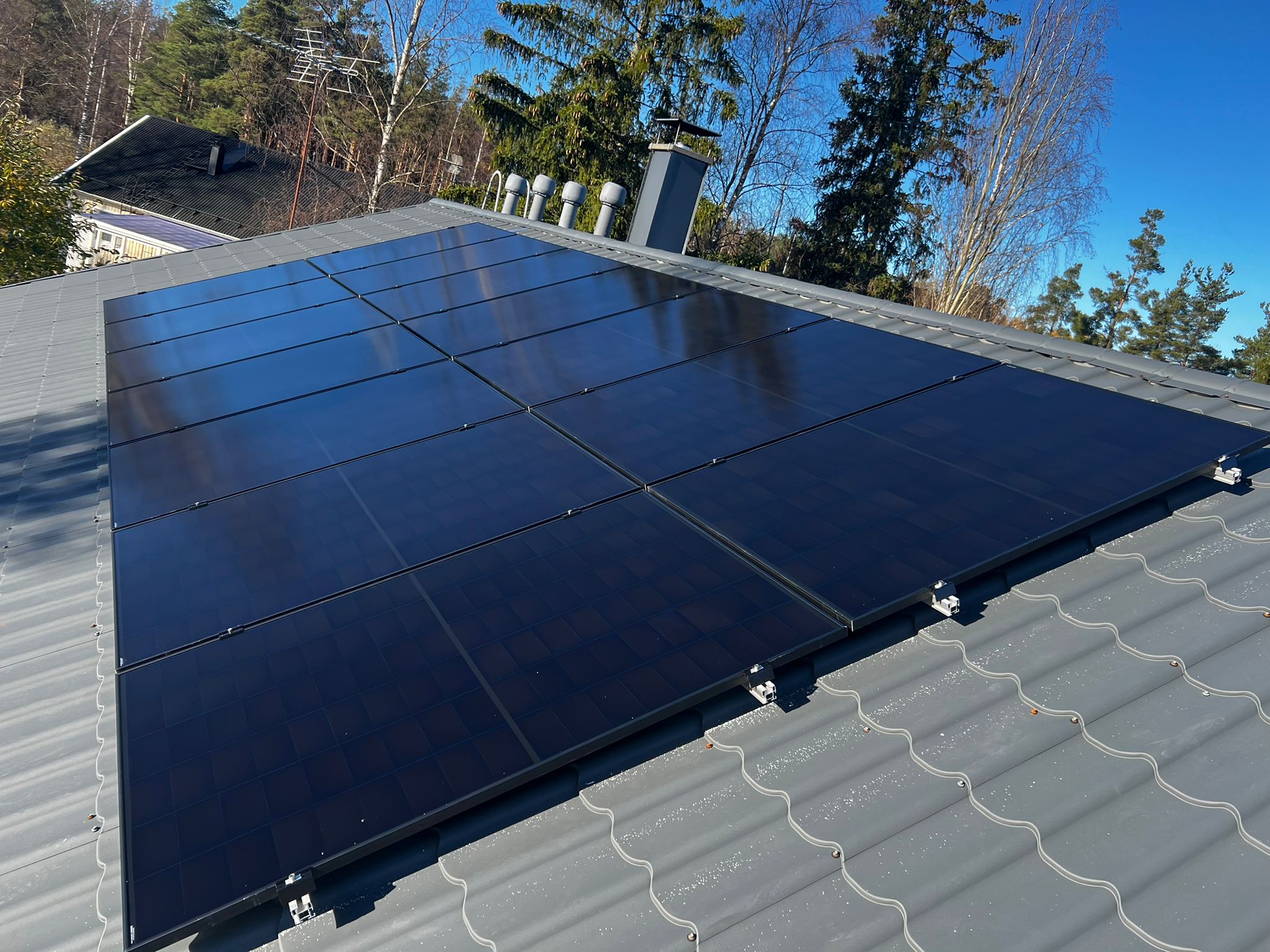 14:sta aurinkopaneelin järjestelmä asennettuna tiilikuviopeltikatolle. Kyseessä Aiko Neostar 450W aurinkopaneelit.