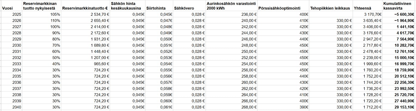 - Reservimarkkinakorvaukset vuodessa: 28,73€*10,80kW*12kk*0,7 = 2 606,38€